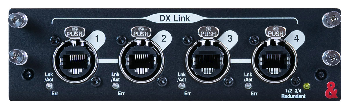 Allen & Heath DX Link allows the user to add up to 128-remote inputs and 64-remote outputs per DX Link module. The card provides 4x DX Link ports, each carrying 32x32 channels of 96kHz audio, that can be used to connect to DX expander units in either Parallel or Redundant mode. In Parallel mode, 1x DX32 or up to 2x DX168/DX012/DX164-W expanders can be connected to each DX Link port. In Redundant mode, 1x DX expander of any kind can be connected to each pair of DX Link ports using two cables for redundant connection.