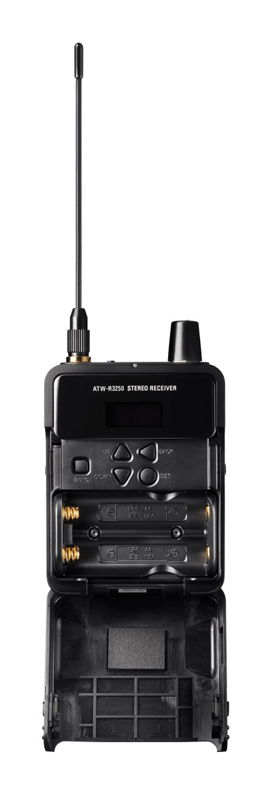 A portable, diversity, bodypack receiver with removable whip antenna that can be used in stereo or mono operation via pan/mix control. The receiver features an OLED display for clear indication of battery level, signal level, frequency set, and menu options. A 3.5mm headphone jack socket allows connection to the included ATH-E40 earphones, whilst the rotary on/off control doubles as a volume controller. Beneath the fold down compartment cover on the front facing side, buttons allow for menu navigation and selection, IR Sync button and IR Sync window allows the synchronisation with the transmitter, and access to battery tray - which takes two AA battery cells. The upper facing edge of the receiver has an LED that illuminates green when powered on and unmuted, or red when powered on and muted. The OLED screen automatically turns off after a period of 30second without button presses. ATW-R3250 can operate continuously for up to 7 hours when powered by NiMH batteries. Rechargeable battery cells can be charged in situ when using the optional ATW-CHG3 or ATW-CHG3N two-bay charging station.