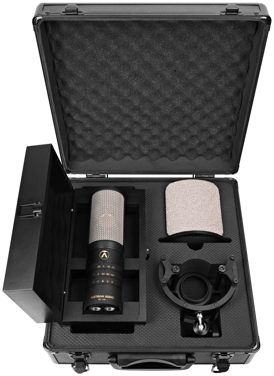 Included accessories: 1x OCSM10 microphone shock mount, 1x OCPF10 pop filter, 1x wooden microphone box, all-black hardcase.