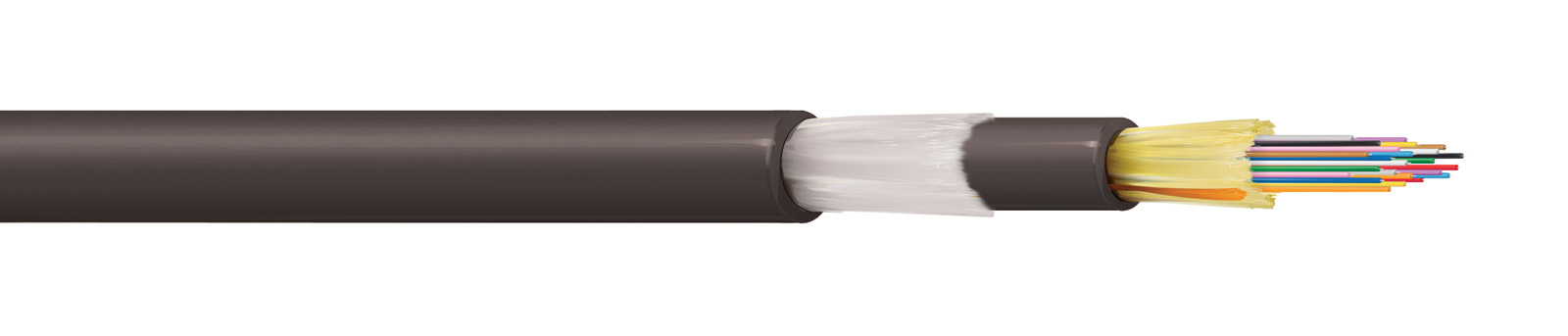 Tight buffered construction exhibiting excellent impact and crush resistance. PUR outer and inner jackets offer flexibility as well as abrasion and chemical resistance with swellable glass yarns between the two jackets acting as additional strength members. Beneath the inner jacket is a swellable yarn which expands if it comes into contact with water and seals minor cuts or punctures. This compact round cable is easily reeled and has a low shape memory. Available with 2, 4, 6, 12, or 24 cores. These multimode versions have a 50/125 OM3 core optimised for 850nm and 1300nm suitable for transmission rates up to 10Gbit/s.