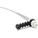 The Cable Saver can be positioned to either termination or capsule ends of the microphone by pushing the capsule or connector through the ‘rubber eye’ then tightly winding the microphone’s cable around the dents in the centre before pushing the same end of the microphone through the second ‘rubber eye’. More than one can be added to a single lavalier microphone cable, normally one at each end, to give improved elasticity.