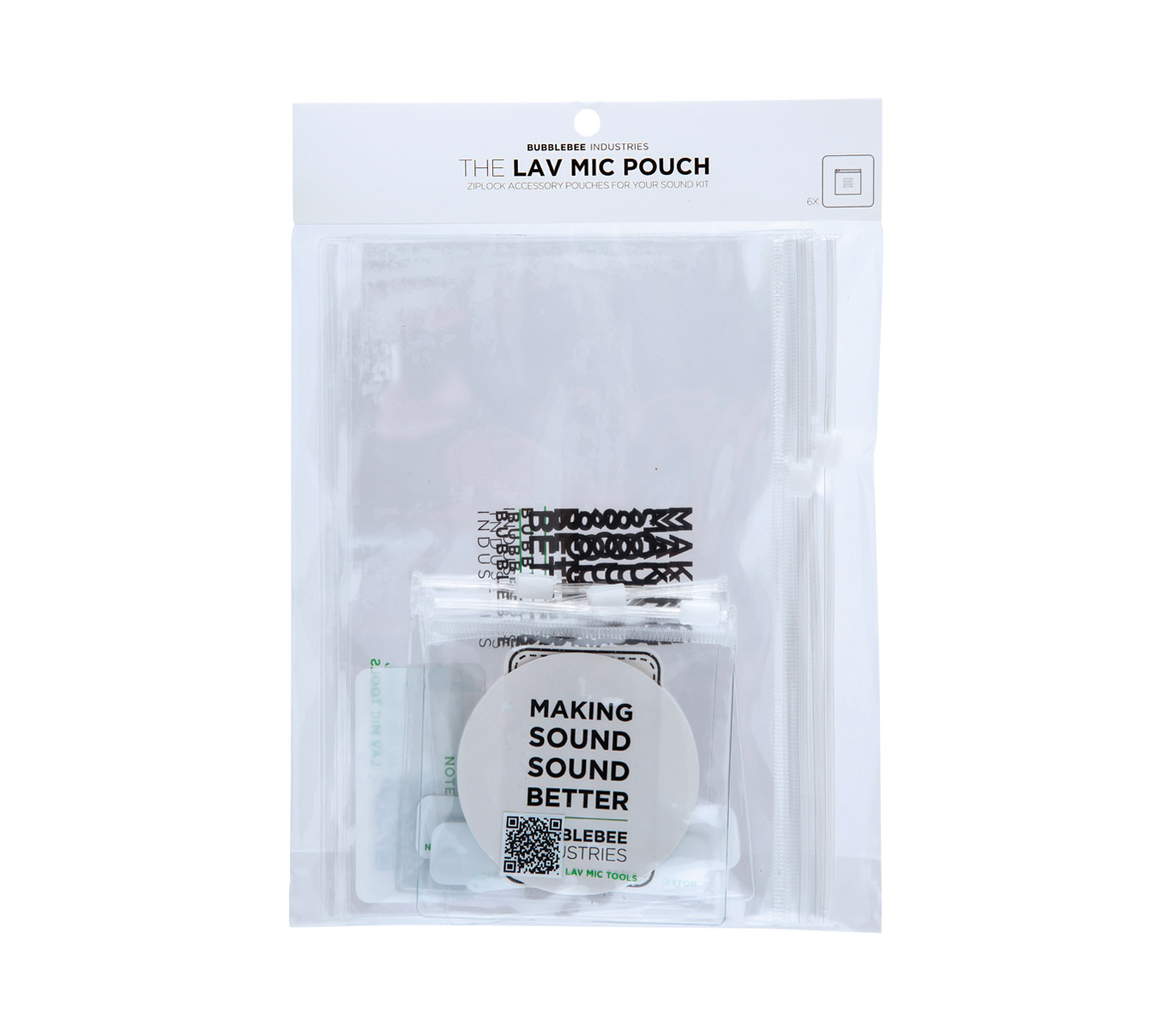 A pack of six 'durable', transparent pouches with ziplock closure. The pouches have been designed to store and isolate lavalier microphones before and after use.