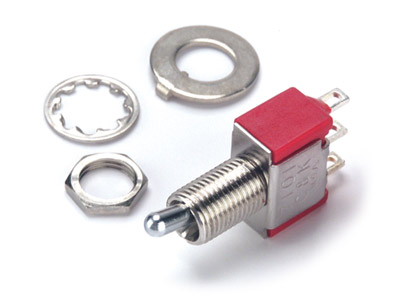 C&K manufacture an extremely large number of switches. The 7000 series of miniature toggle switches comes in a variety of versions, one being the "M" toggle variety. This has a short, recessed lever, that withstands knocks and is extremely resistant to damage. The "21" toggle variety has a broad black plastic lever, with a rectangular mounting profile. The "J2" type is for PCB mounting behind a panel, without bezel.