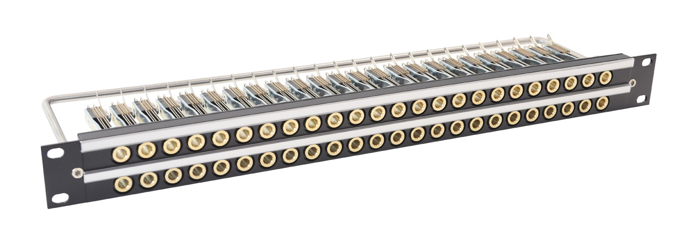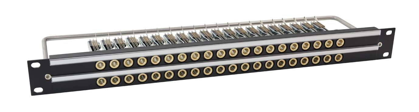 The industry standard Mosses and Mitchell B-Gauge jacks are set at 'mono-pitch' (equally spaced) in two rows of 20, 24 or 26 in a 1U panel. Jacks are 5-point, palladium-contact type with a heavy duty nickel-plated frame and brass front ring to ensure a long and reliable operational life. Supplied complete with a single, central lacing-bar and a snap-on cover designation strip for each row of jacks. Overall depth 115mm.