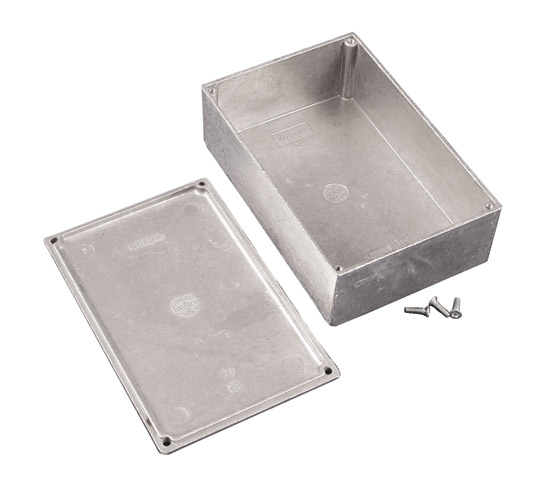 A range of aluminium diecast boxes, manufactured by Hammond Electronics to BS1490. Close fitting flanged lids are secured by 4 or 6 countersunk screws depending on size (M3.5 ×12 taptite). Boxes are supplied unfinished, but the surface will accept any finish with the minimum of preparation. Designed to meet IP54 specification.