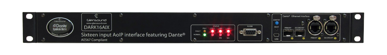 Dark1616M is a dedicated, rack-mounting, Dante Ethernet interface, designed for use in demanding broadcast environments. It has sixteen inputs and outputs available as analogue balanced inputs, which may be selected to microphone, microphone with 48V phantom power and line levels and outputs, and also as eight AES inputs and outputs (sixteen digital channels). It can be used as a stand-alone interface into a Dante network or in conjunction with a second, directly-linked, Glensound interface as an audio 'snake', or used as the network-connected or point-to-point interface to Glensound's Dante commentator units.