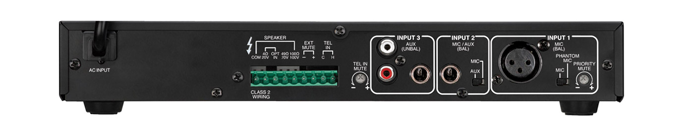 The amplifiers have three mic/line inputs with differing input connection type. Channel 1 input is 3-pin XLR with dedicated phantom power switch. A second input, via 6.35mm jack, is located on the front facing panel. This secondary channel 1 input overrides the XLR input on the rear. Channel 2 input is via jack 6.35mm jack socket, and channel 3 input via dual RCA (phono) or 6.35mm jack connections. Channels 1 and 2 are independently mic/line switchable. Speaker output is via terminal block with options for 4ohm, 70V or 100V line. A telephone input with priority is positioned on the same output terminal bloc, along with external mute remote connection. Power is via captive mains cable.