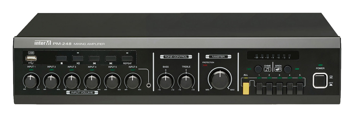 INTER-M PM248 MIXER AMPLIFIER 1x 480W, 70/100V/Low-Z, 6-input, USB input, chime/siren Stock code: 93-727
