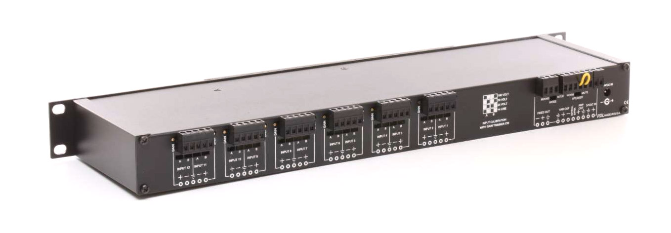 The RM-MP12A is intended for monitoring the level of up to twelve separate mono inputs, each of which can be individually adjusted to suit unbalanced consumer, balanced professional, 8 ohm speaker line or 25V, 70V or 100V speaker lines. An interlocked selection system chooses the input or inputs to be monitored, which are then displayed on a meter and can be monitored on internal or external loudspeakers and/or headphones. Both variable and fixed-level line-level outputs are available. The device is powered from 24V DC, and mounts into a single unit of 19-inch rack space.