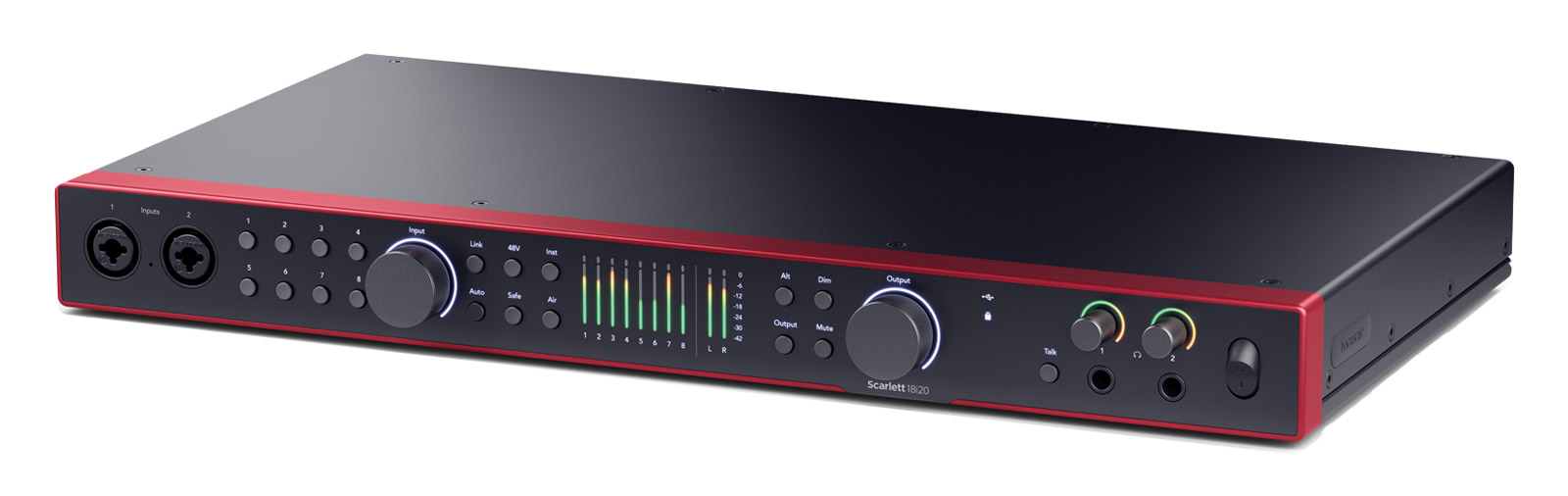 Scarlett 18i20 is a features 18 inputs and 20 outputs, including eight mic preamps, Hi-Z and line inputs, ADAT, SPDIF, MIDI, and Word Clock. 18i20 has a built-in talkback microphone, A/B speaker switching for referencing on different monitors, and eight channels of LED bar metering which can be assigned to inputs or outputs, along with master output metering.