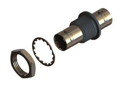 Panel-mounting, double-sided BNC connectors (also known as 'back-to-back' or 'bulkhead through-adapter'), designed for 12G 4K UHD applications. They have gold-plated beryllium-copper centre contacts for optimum mechanical performance. Connector bodies, nickel or gold plated, are insulated from the panel, and have a black mounting bush.