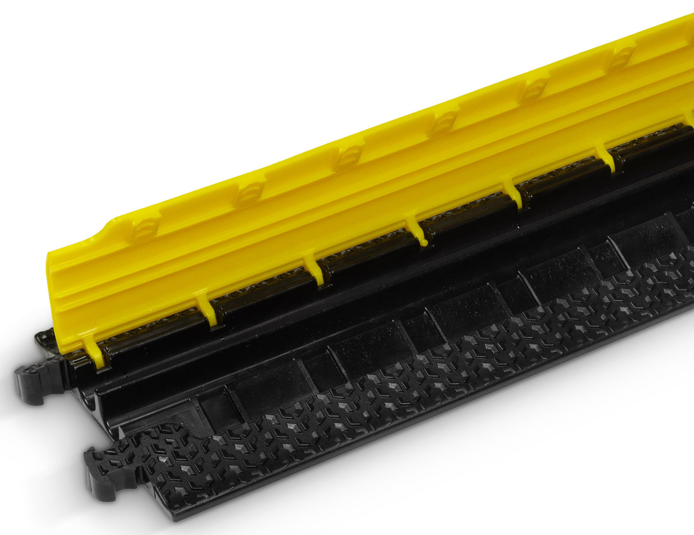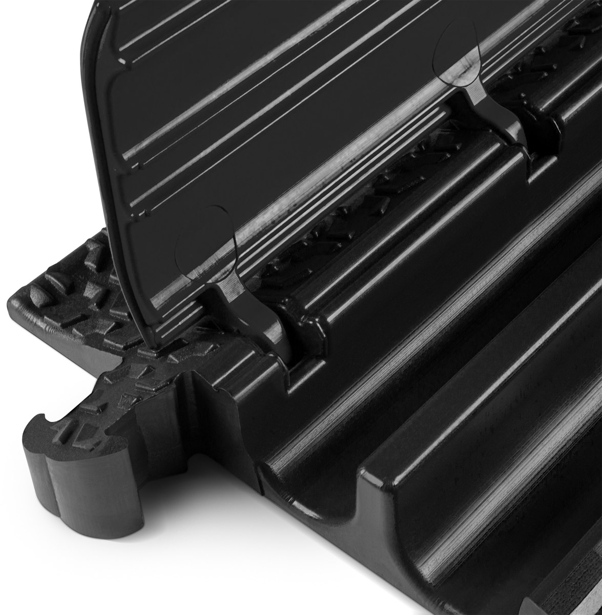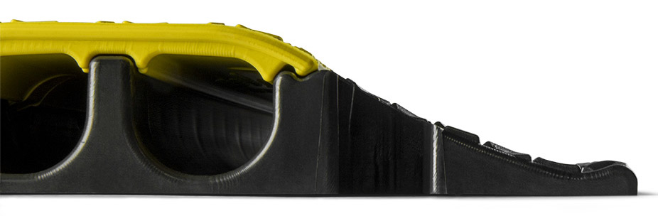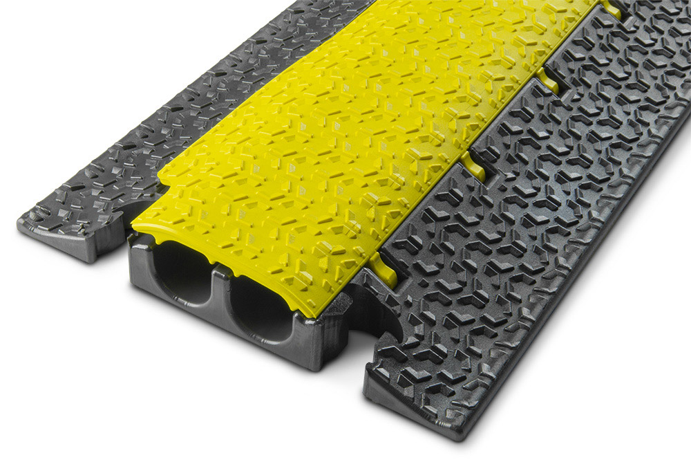 Defender cable crossovers are for use across roadways and walkways and open venues, in fact anywhere that cables are left exposed in hostile environments such as construction sites, warehousing, carnivals, exhibitions and music events. Most are coloured black and yellow for high visibility and consequently maximum public safety, however some models are coloured blue to better signify wheelchair compatibility. The top surfaces have anti-slip treads with no ridges or crevices to trip a pedestrian.