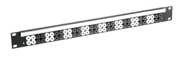 1U black painted rigid extrusion fitted with 2 rows of 32 sockets, 4.1mm type spaced both horizontally and vertically to enable them to be used with all standard PO type 4.1mm U-links, and suitably spaced 2 pin connectors such as the PO type 231A. Standard 4mm plugs may also be used. A snap-on cover designation-strip holder is fitted to the top of the panel, permitting the supplied paper strips to be inserted before or after installation; 7.5mm of printable height is available. Templates for printing designation strip labels, available as a DWG file for AutoCAD and compatible applications, can be downloaded from the appropriate product page on the Canford website.