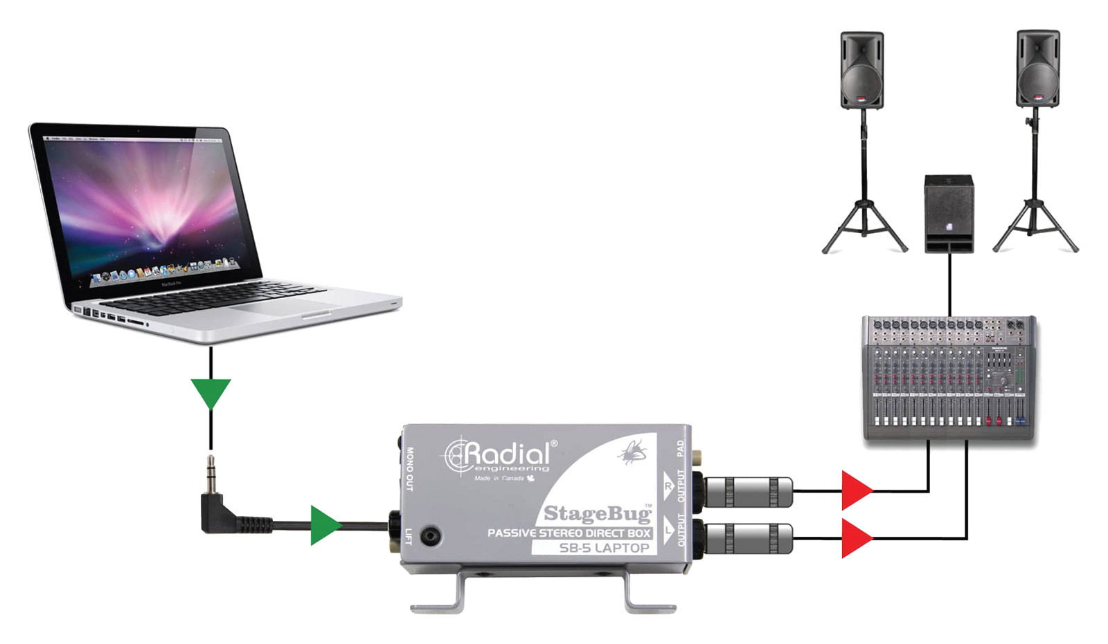 RADIAL STAGEBUG SB-5 DI BOX Passive, stereo, captive 3.5mm TRS jack input, for laptop/mobile device Stock code: 20-0011