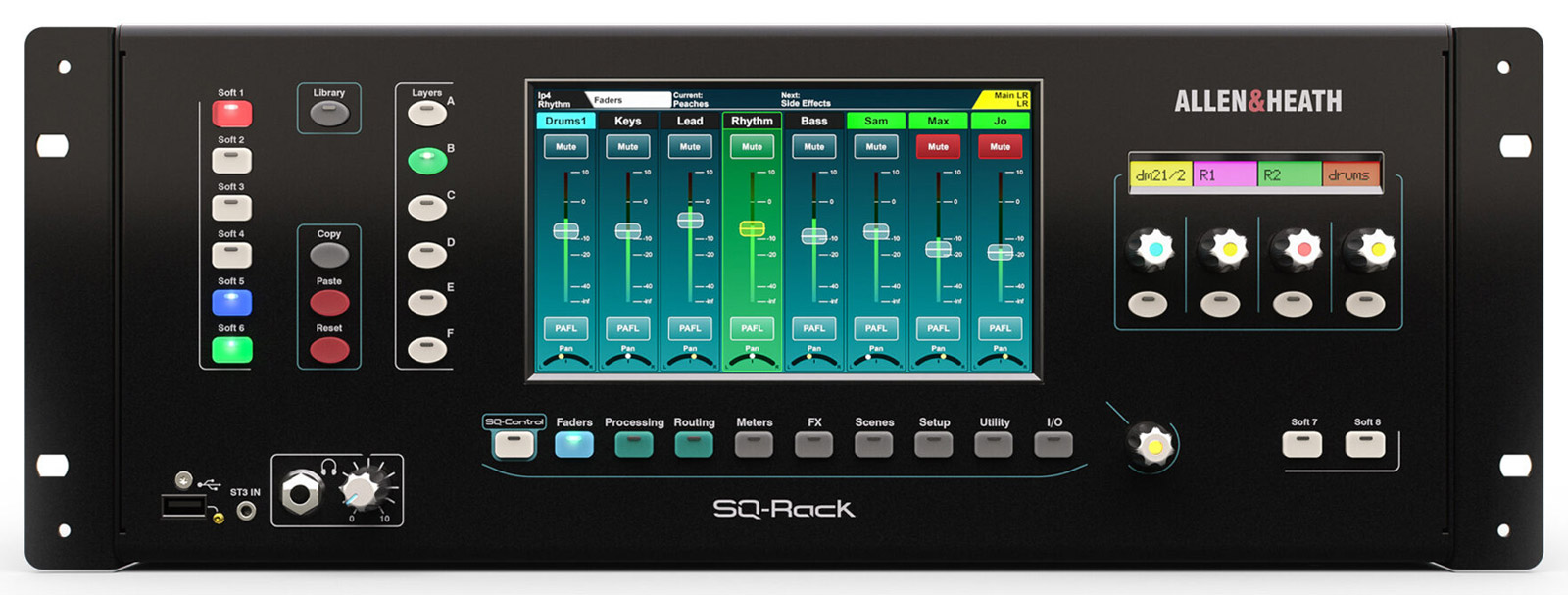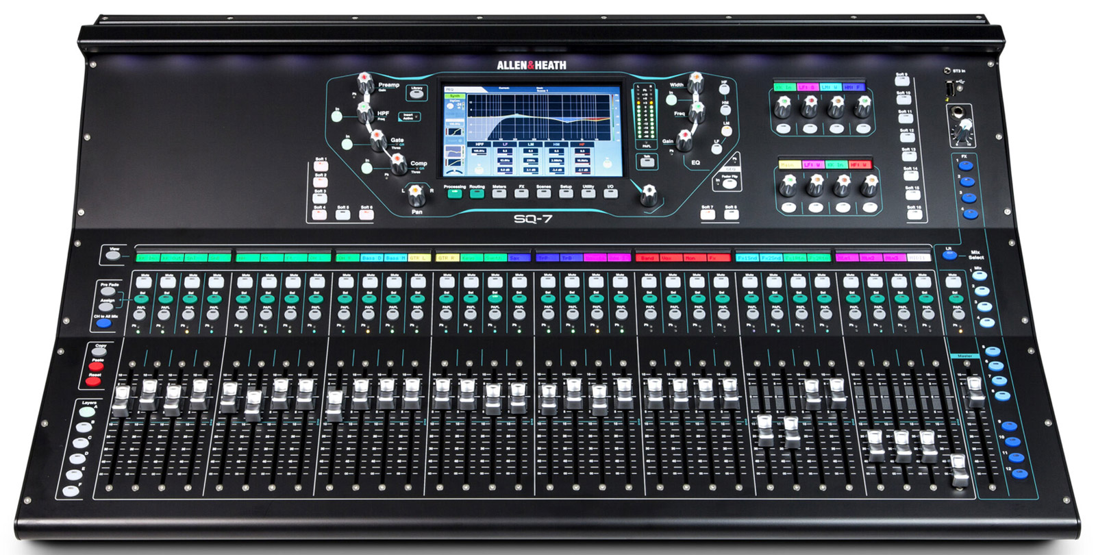 Aided by the 7-inch RGB, high-resolution touchscreen, Allen & Heath have integrated a user interface that allows drag-and-drop layout changes, allowing custom naming and colouring on any channel strip; intuitive menu design and ergonomic function editing; and softkeys for commonly used functions. SQ-6 and SQ-7 also feature assignable soft rotary controllers for detailed editing. Each input has a high pass filter, a 'super-fast' gate with sidechain and filter, a 4-band parametric equaliser with RTA, and Peak/RMS compressor for control and shaping of levels and transients. The consoles also feature eight stereo effects engines and are delivered with RackExtra library - which features emulations of classic reverbs, gated reverbs, delays, and modulators. Every engine has its own dedicated stereo return too, so as not to use up any of the 48 input channels. Mixes have both a parametric and 28-band graphic EQ along with compressor as standard.