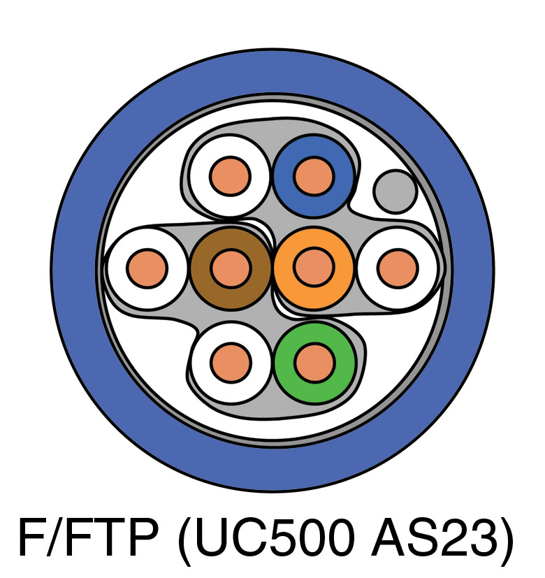 They have a Draka patented foil screen over pairs 1 and 2 (blue, orange) and another over pairs 3 and 4 (green and brown). The F/FTP and S/FTP types are like U/FTP but respectively include a foil with drain wire overall screen or tinned copper braid overall screen.