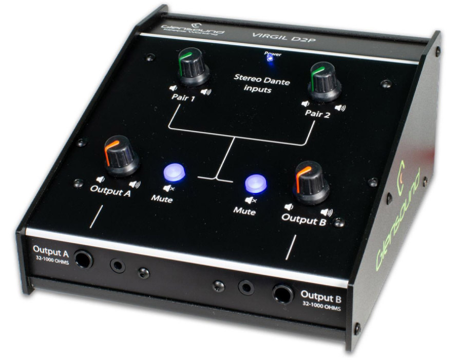 D2P is a headphone monitoring solution designed for use when two users sit next to each other, both needing to monitor one or two stereo sources. The two stereo sources come from the Dante/AES67 network and can be mixed for monitoring. Each of the stereo inputs can be routed to either headphone amp or both. This allows the users of a D2P to share the same stereo mix, or just monitor an induvial stereo input each. Each user also has their own mute button.