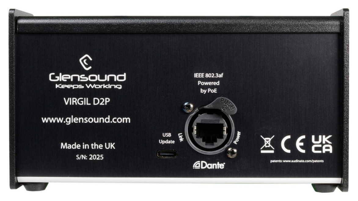 The rear facing panel houses RJ45 network connection for Dante audio and PoE, and a dual purpose 5V USB socket that can be used to power the Virgil from a compatible USB power adapter, or upload new firmware if required.