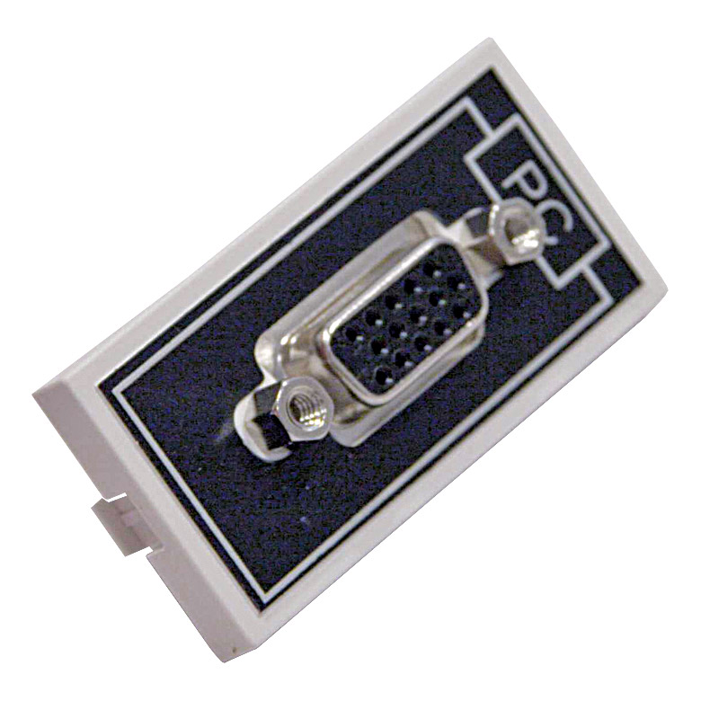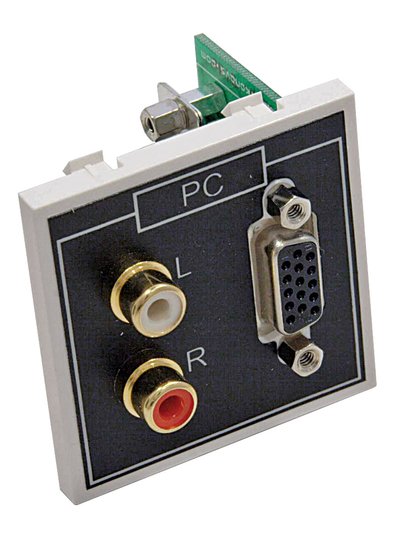 Front panel HDD15 socket for VGA and rear 90 degree HDD15 socket allowing the use of pre-made VGA cables. The module is also fitted with two gold plated RCA (phono) sockets for audio (labelled left and right) with rear panel solder connections. Depth required: 35mm Note: Due to the size of a VGA plug, this module should always be used at the right hand location within a 100mm frame.