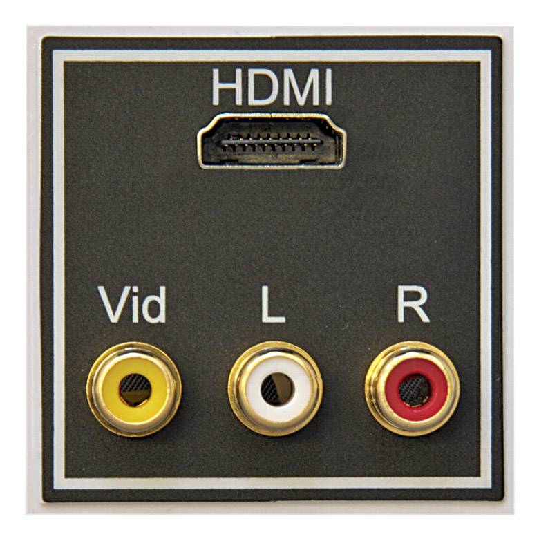 Front panel HDMI socket linked internally to a rear 90 degree HDMI socket, for use with pre-made HDMI cables. Also fitted with three gold plated RCA (phono) sockets, one for video (yellow) and two for audio (labelled left and right) with rear panel solder connections. RCA (phono) and HDMI connections arrayed horizontally. Depth required: 20mm.