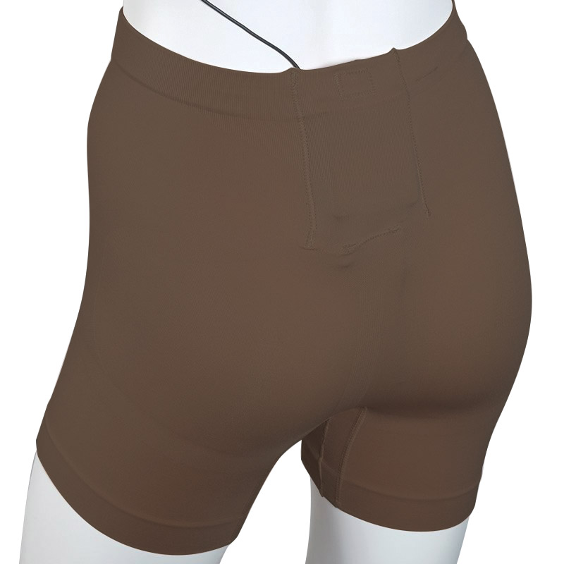 URSA Shorties are form-fitting 'shape-wear' designed for women and allowing the discreet mounting of up to three body packs utilising the three built-in pouches. The 'comfortable' shorts have a low profile when worn, and are often worn under tight outfits for live performance, TV and Feature Films. Available in four sizes and three colours (black, beige, and brown) , the Shorties feature two, non-slip pouches on the inner leg and a single pouch on the lower back. The body pack position is retained via a popper which keeps the transmitter securely rigged inside with aerials in an upright or down-facing position. The same is applicable to all pouches on the Shorties.