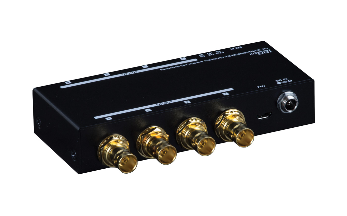 The splitter has a metal case, with the front panel having three multi-coloured LEDs to signify power status, sync status and data rate. The rear of the unit houses seven gold-plated 75ohm female BNC connectors - one for input and six for output connectivity. A 2.1mm locking power supply input for the included 5V DC power supply is also positioned on the rear panel.