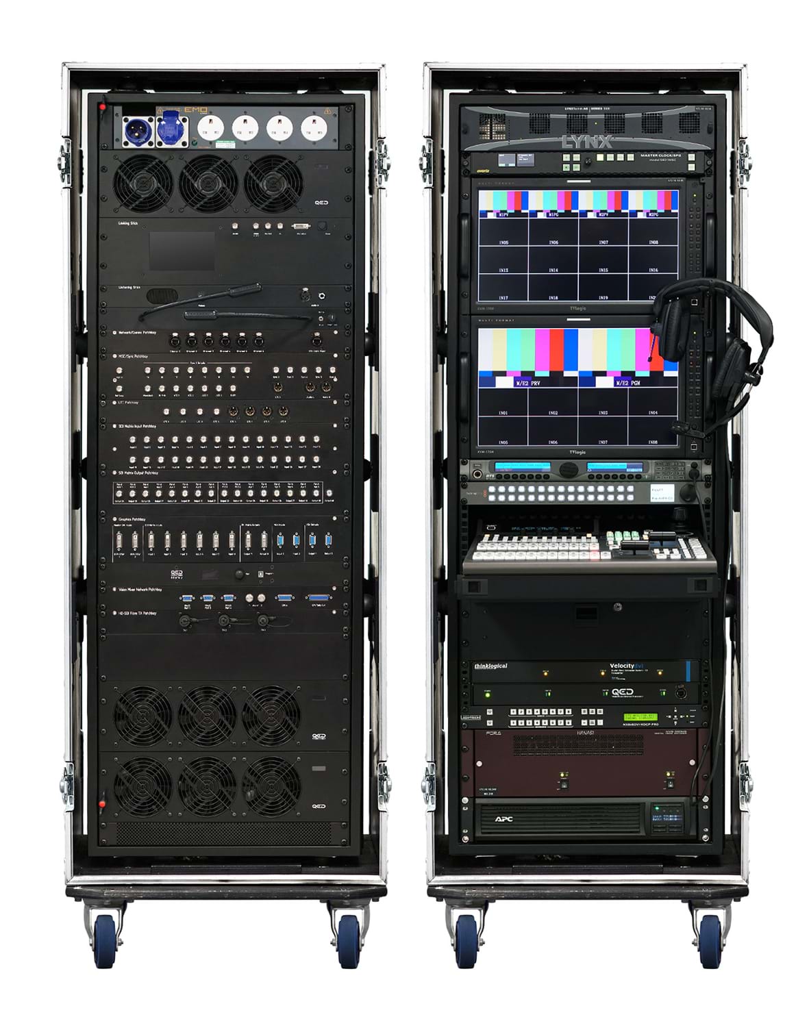 QED decided to create a set of Portable Production Unit (PPU) racks to further extend their comprehensive stock of hire equipment. These provide full production and engineering facilities for HD multi-camera applications in the corporate and events industries and are built into mobile 32U flight cases for flexibility and easy transportation. The QED engineering team identified that one of the keys to rapid rigging, de-rigging and integration to external systems was to provide full facilities on rear patch panels to the engineer, clearly laid out and labelled.