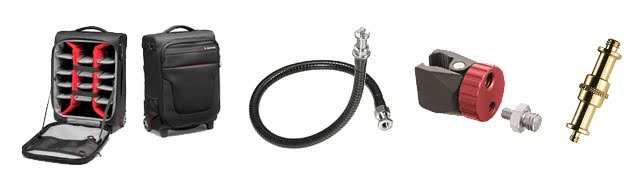 Roller Bags or portable padded cases on wheels, varying dimensions allow a range of camera and lens combinations, along with various laptop sizes, to be accommodated. Most are suitable for carry-on use. Other groups introduced include a range of Support Arms allowing posturing of accessories, Clamps allowing a range of fixing options for equipment or support arms and Studs and Connectors which contains a range of various adapters for spigots, thread sizes and more.