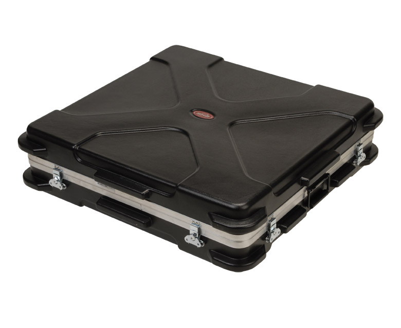 The lid of this briefcase-style model lifts off: A hinged, frame tilts up and is held in position by a ratchet system. The frame provides 12U of rack-mounting space, suitable for 19-inch mounting mixers and other shallow equipment. The case stacks on top of SKB 19-inch rack cases. Rack-mounting depth: 127mm.