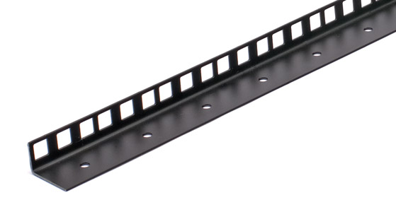 Double angle 1.5mm thickness (16 gauge) steel angle. Standard punching (3 holes per 'U') in narrow flange for rack mounting, mounting holes punched in wide flange, 2 hole punching per 'U' in 'sideways' rear flange for mounting horizontal rails, slides, cable tray etc. Supplied in 2 metre lengths (45U). Black painted finish. Cage nuts type 16-025 are suitable for use with this strip.