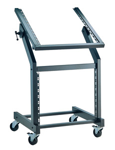 A series of desk and floor mount studio racks with steel rack rails from K&M.