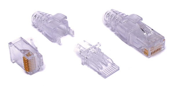 Cat5E types are supplied with cable management bars (plastic inserts with eight holes, which thread over the wires to hold the geometry of the pairs). Shielded versions include a ferrule which is crimped over the braid and drain-wire which have been pushed back over the outer jacket and then trimmed after crimping.
