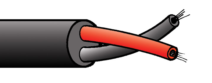 General purpose loudspeaker cables similar in construction to 2-core (GPS-LFH 2-core) and 4-core (GPS-LFH 4-core) mains cables, but manufactured specifically for use as loudspeaker feeds and with Low Fire Hazard ('LSOH') materials. Cores are twisted, coloured red and black (GPS-LFH 2-core) or red, black, violet and grey (GPS-LFH 4-core), and the cable is marked 'Loudspeaker cable' to clearly distinguish it from mains cables for safety reasons.