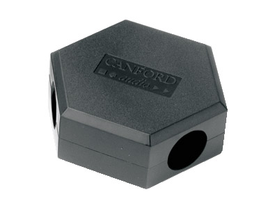 Hexagonal box with positions for three Neutrik ‘D’ size or Canford Universal Series connectors (not suitable for Powercon connectors), allowing Y-splitters or T-pieces to be made. The box is in two halves, with the connectors in recesses in the moulding without screws, held firmly in place when the three lid screws are tightened. Plastic packing pieces are supplied with each box to allow for different connector flange thicknesses. The box is moulded from virtually unbreakable black ABS.