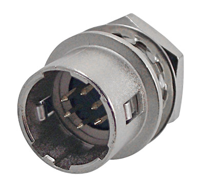 Miniature 4, 6 and 12 pin connectors, 5 keyway orientation guides and sliding ring locking (pull to de-latch, automatic latch engagement on insertion). Pin contacts recessed to prevent damage when trying to find correct keyway alignment. Matt nickel finish zinc/brass alloy shells, gold plated pins. Cable diameter range 4.8-5.2mm (4 and 6 pin types), 6.8-7.2mm (12 pin types), smaller cables should be brought up to this diameter by using Hellerman sleeving. The plug insert is screwed into the shell, but as the main (sliding) part will rotate, the best method is to mate the insert with a chassis-mount type, and use this to hold the insert while the shell is screwed on. An open ended spanner is useful to tighten body onto insert, and cable clamp onto body, size 8mm across flats for 4 and 6 pin types, 11mm across flats for 12 pin type.