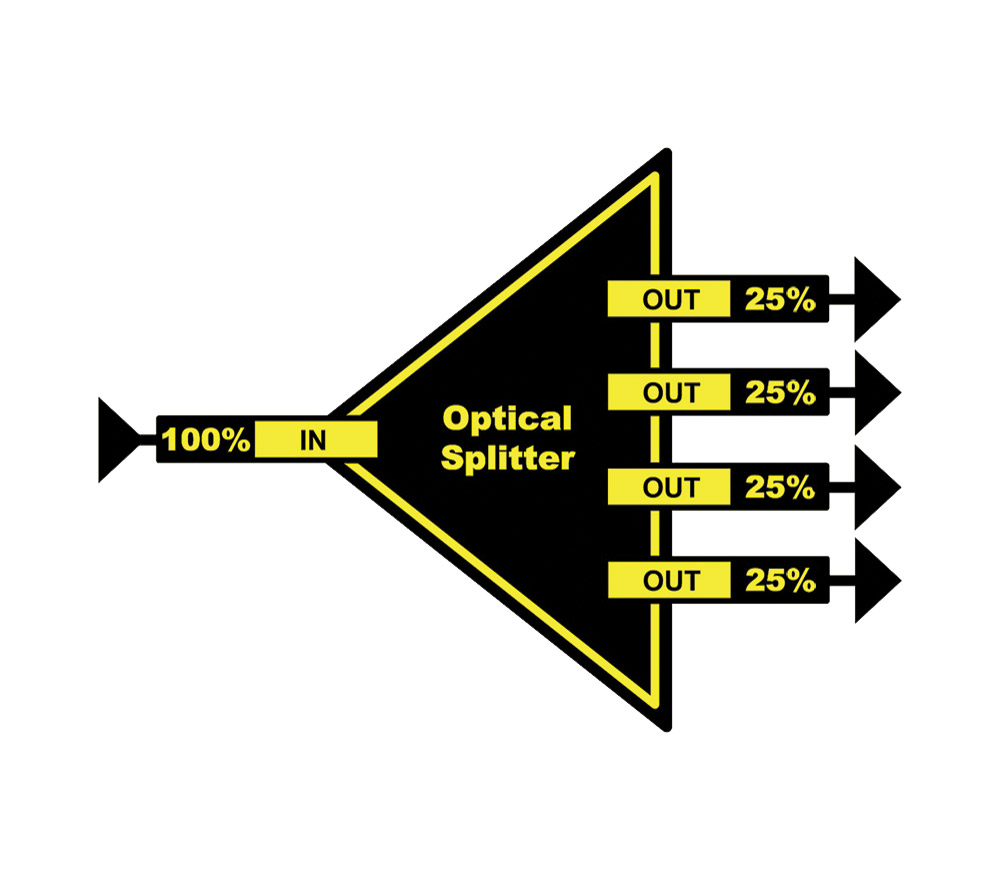 OSP 1814 A 1:4 optical splitter with one input (100%) and four outputs (each 25%)