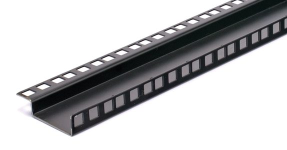 'L' section 2.0mm thickness (14 gauge), heavy duty steel angle 50mm x 18mm. Standard punching (3 holes per 'U') in narrow flange for rack mounting, mounting slots punched in wide flange. Supplied in 1820mm (41U), 2000mm (45U) lengths. Cage nuts type 16-026 are suitable for use with this strip.