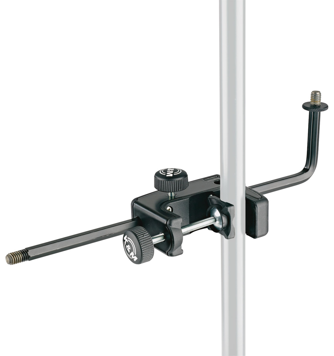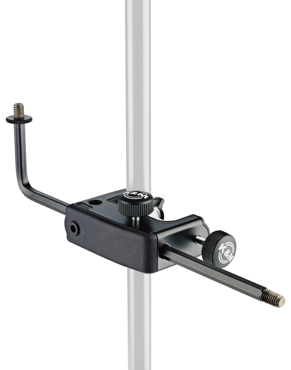Sometimes know as a 'guitar clamp', this clamps to the stem of stands with tubes up to 30mm. Arm length: 232mm. Captive 3/8" screw offers a mounting solution for microphones, media holders etc at any position on a stand. Load capacity 0.75kg. Black finish. Weight 0.34kg