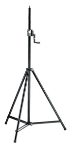 A tripod stand with braced, folding legs, this has a hand crank with push-button and locking screw adjustment. Height range: 1385-2180mm. Top diameter: 35mm, to suit flanges, integrated M10 threaded bush for fastening crossbars. Rated load capacity: 40kg. Weight: 7.65kg.