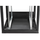 A 'pagoda style' roof sits spaced 10mm above the top frame. This removable roof allows for the fitting or maintenance of a roof-mounted fan-tray without affecting the construction of the cabinet frame or any equipment mounted within the cabinet. On 800mm wide models the roof has an integrated, brush-strip entry-point on each side. The bottom frame includes a large cable-entry point, with an integrated, rubber-edged, sliding-plate to hold cables in place and prevent dust ingress. Racks are supplied fitted with heavy duty castors and include a set of levelling feet, each with a maximum load of 600kg per set of four. Note that castors and levelling feet cannot be used together.