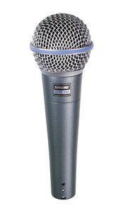 A 'high-output supercardioid dynamic vocal microphone designed for professional sound reinforcement and project studio recording', the Beta 58A 'has become a leading choice among vocalists and touring professionals worldwide'. Maintaining a' true supercardioid pattern throughout its frequency range', the Beta 58A has a 'shaped frequency response that is ideal for close-up vocals'. The 'superb performance of this microphone' is 'not affected by rough handling' because of it's 'rugged construction, proven shock mount system, and hardened steel mesh grille'.