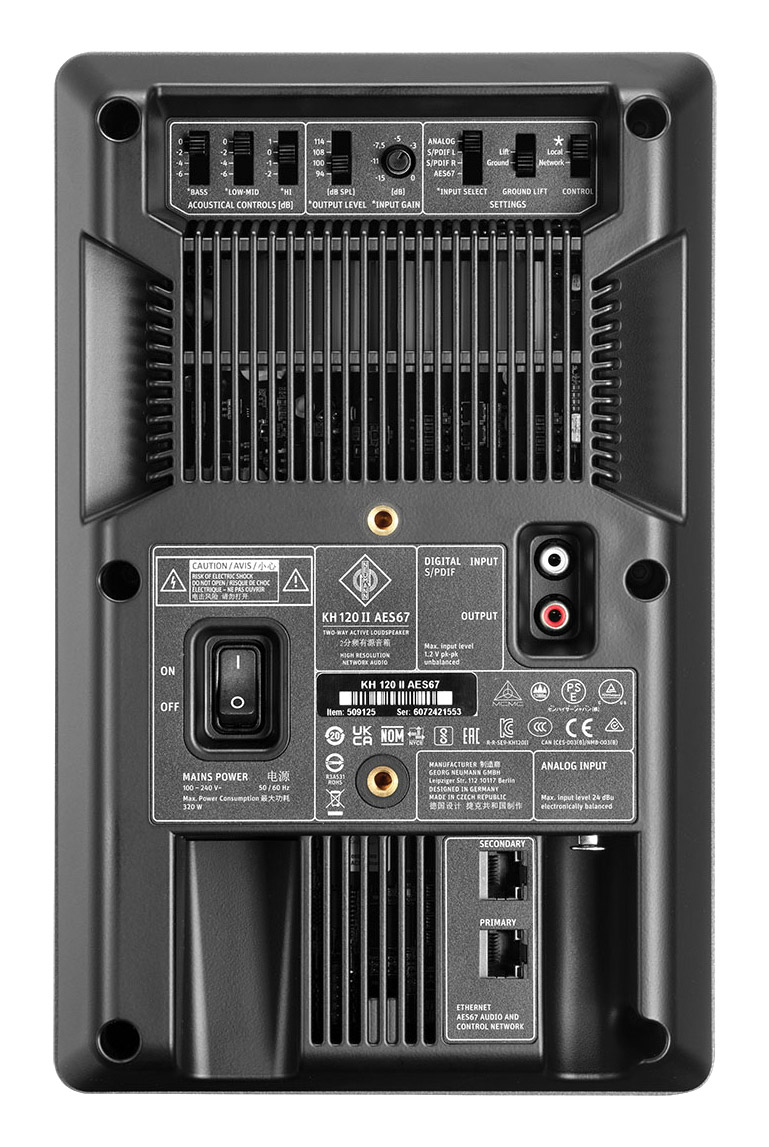 Available in metallic anthracite (KH 120 II UK) or white (KH 120 II W), Neumann KH 120 II has been designed for near field monitoring with a distance of 1-2 meters, in mixing or mastering studios and broadcast studios or as a rear loudspeaker for larger multi-channel surround systems often used in post-production studios. Driven by class D amplification, the low frequency amplifier provides up to 145watts whilst the high frequency driver provides up to 100watts of output power. KH 120 II offers a linear frequency response of 44Hz - 21kHz and a maximum sound level of 116.8dB SPL, 88/93dB (single/pair) maximum long term SPL. Both 5.25 inch LF driver and 1 inch HF dome are magnetically shielded. An illuminated Neumann logo is white under power on and red when limiting or clip sensing. The rear facing side of the monitor has all connectivity and control including a rotary gain control, switchable output level, and three switch bass/low-mid/treble controls. Analogue input is via electronically balanced 3-pin XLR socket, digital S/PDIF audio I/O is by way of 75ohm RCA connection, and AC mains connection is by way of IEC. A latching rocker switch is used for power on/off.