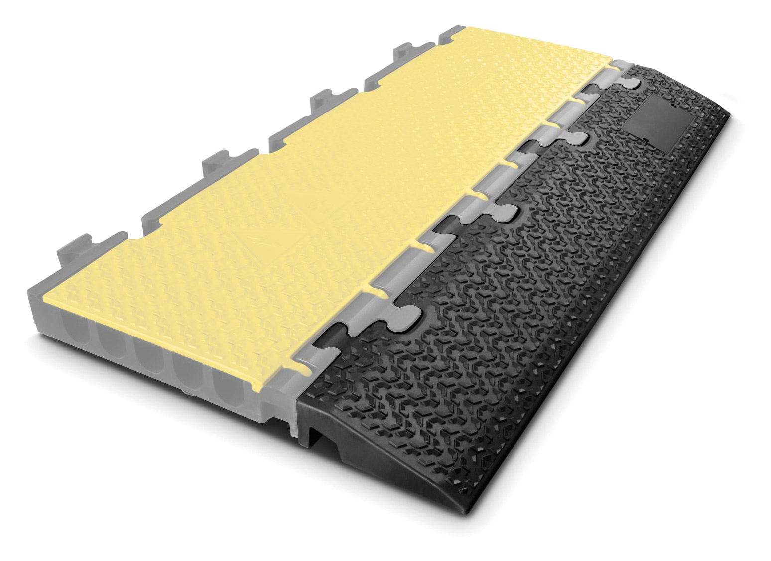 Defender cable crossovers are for use across roadways and walkways and open venues, in fact anywhere that cables are left exposed in hostile environments such as construction sites, warehousing, carnivals, exhibitions and music events. Most are coloured black and yellow for high visibility and consequently maximum public safety, however some models are coloured blue to better signify wheelchair compatibility. The top surfaces have anti-slip treads with no ridges or crevices to trip a pedestrian.