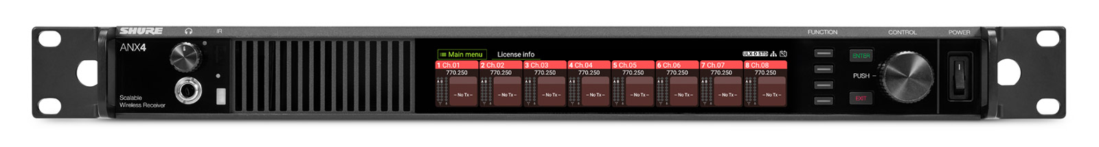 ANX4 does not ship preconfigured with active wireless channels, affording the user the opportunity to purchase channels in single- and four-channel increments and activate the exact number of channels required. Licenses can be activated in one ANX4 and later removed and activated in a different ANX4 as needs change. ANX4 channel licenses are perpetual licenses, not subscription-based licenses, and can be managed via the user's ShureCloud account. All the features found in Axient Digital and ULX-D receivers are available in the ANX4, and with a 1U rackmount format, streamlined antenna configurations for large channel count environments can be achieved.