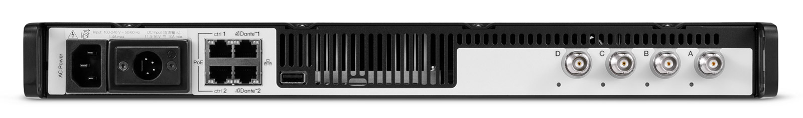 The rear facing panel hosts 100-240V AC mains input via fused IEC connection, output power via IEC connection, USB connection for firmware updates, event logs, and data storage; dual network control connections via RJ45 connections, Dante 1 and Dante 2 connections, and six BNC antenna connections. AD600-DC has the same feature set however it the output power connector by way of 4-pin DC power connector.