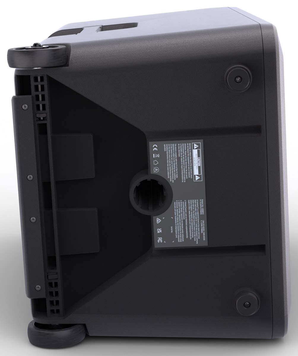 The internal batteries are charged when the unit is connected to main power via the included IEC power cable. A 4-segment battery charge status display illustrates 100% battery life remaining when 4x LEDs are lit; 75% battery remaining when 3x LEDs are lit; 50% battery life remaining when 2x LEDs are lit, and 25% batter remaining with 1 LED lit. If only the first LED flashes the current battery remaining is below 10%. At this point the unit should be connected to mains power immediately for charging. Battery operating time is 5 hours with music played at full volume; 25 hours with ECO preset and mid-volume output; 3.5 hours when 80% remaining and no output. Charging time from 0-100% is 7 hours.