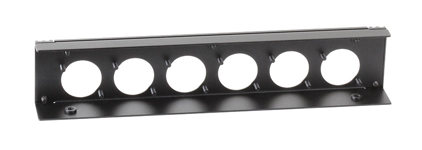 A black panel with a ‘slide-in’ label strip with polycarbonate window. It has four sets of apertures and captive threaded bolts to rear-mount either AMS Series modules, Canford Universal Series connectors, connector plates and switch plates, or any connector with dimensions to match the Neutrik D-Series housings. The panel will mount in any standard RDL Rack-Up mounting aperture, using the mounting screws supplied. Dimensions: 147.3 x 42.5 (w x h) mm.