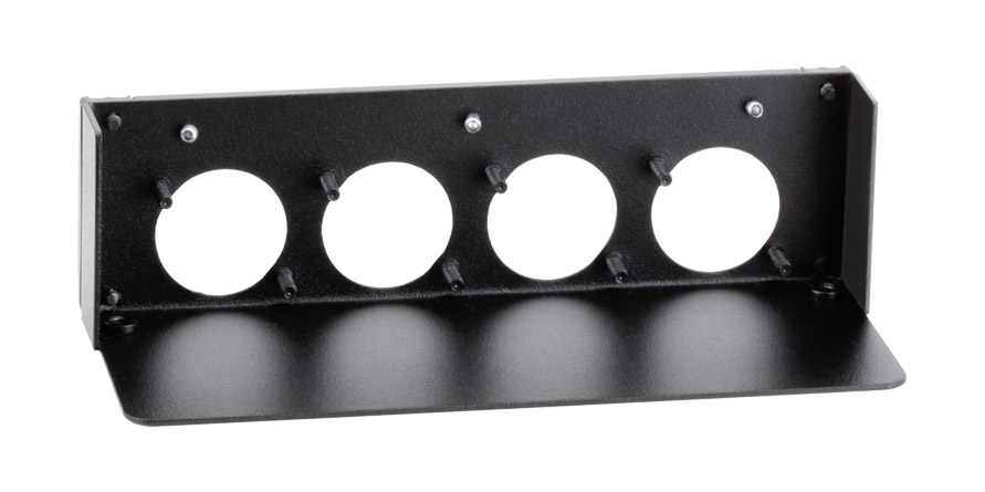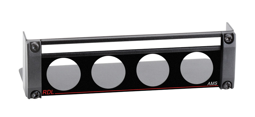 A black panel with a ‘slide-in’ label strip with polycarbonate window. It has four sets of apertures and captive threaded bolts to rear-mount either AMS Series modules, Canford Universal Series connectors, connector plates and switch plates, or any connector with dimensions to match the Neutrik D-Series housings. The panel will mount in any standard RDL Rack-Up mounting aperture, using the mounting screws supplied. Dimensions: 147.3 x 42.5 (w x h) mm.