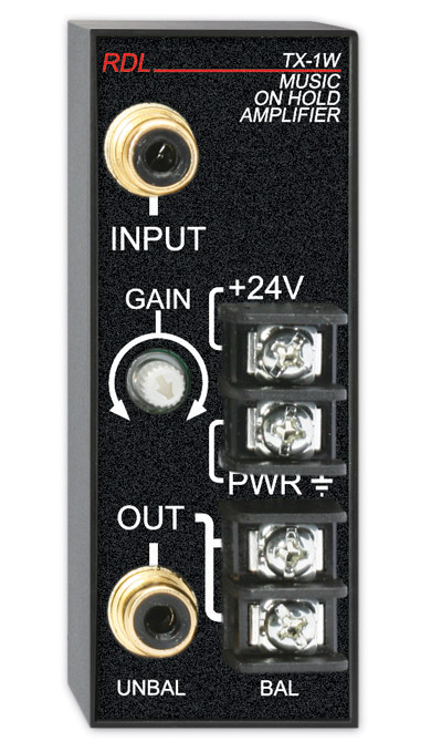 For use where a PABX or key telephone system needs to be fed with music, speech, or a mixture of both. When a call is placed “on hold”, the audio quality perceived is affected by the caller’s own telephone earpiece, as well as the line quality and system design. Due to these variations, conventional audio amplifiers used as “music-on-hold” drivers often produce annoying artefacts to the caller. Attempts to reduce listener fatigue through HF roll-off alone tends to produce a muffled, tired sound. The TX-1W features a response specifically characterised to match the broadest variations in telephone audio distribution, producing a lively, crisp, interesting sound. Input on 6.35mm mono jack (–10dBv nom.), adjustable audio level –10dB to +25dB, unbalanced 1 watt output on 6.35mm mono jack, transformer balanced 600R output on screw terminals. Supply: single 150mA.