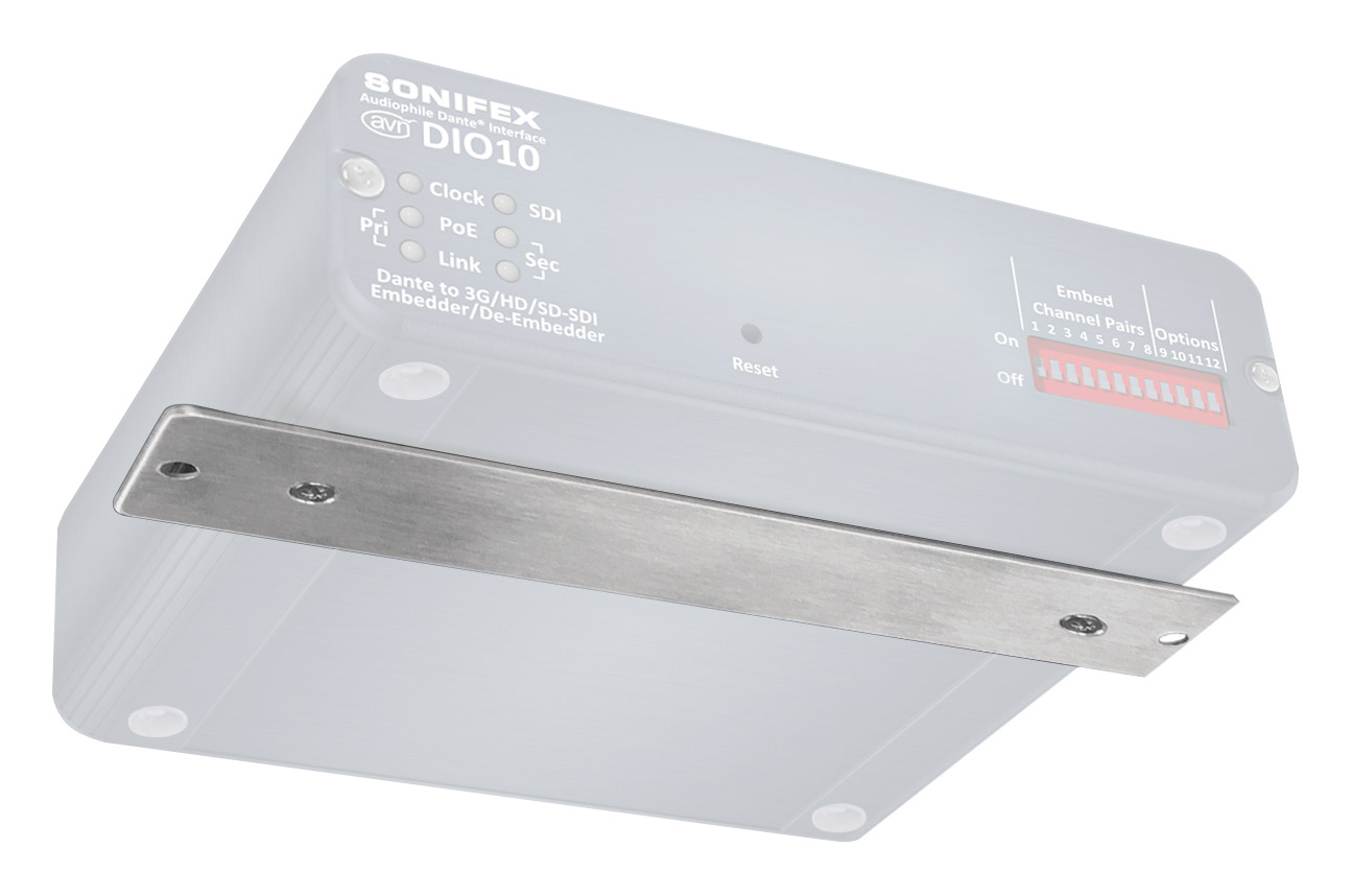 An under-desk mount that enables the user to mount large AVN-DIO units including DIO10, DIO12, DIO14, DIO15, DIO16, DIO19, and DIO20. The metal strip has four predrilled holes - two to mount the DIO unit, and a further two to mount to the underside of the desk.